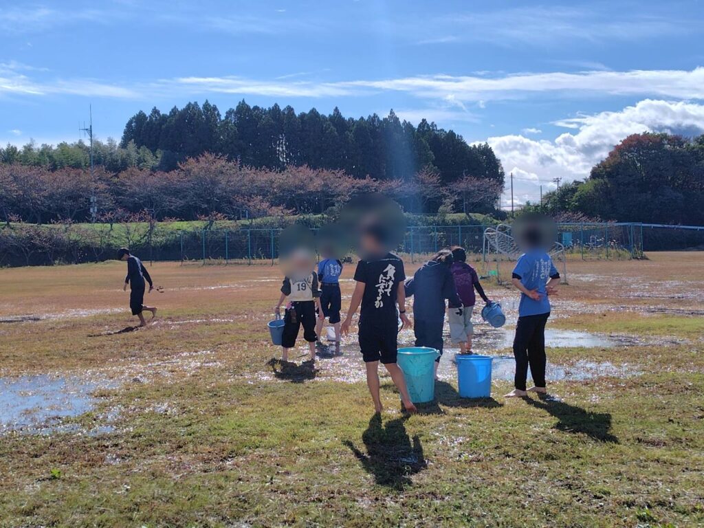 たまった雨水をかき出して駐車スペースを整えたり、校舎内では装飾づくりや出展の設営を進めたりと、それぞれの持ち場で懸命に動く姿がありました。